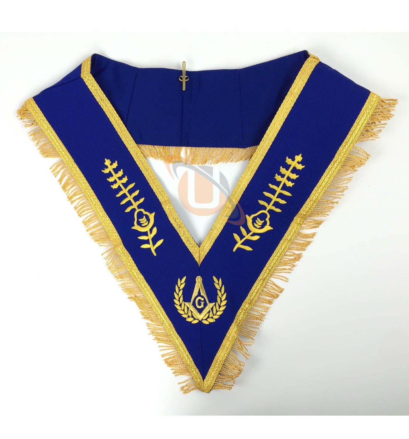 Past Master Mason Apron High Quality Blue Lodge Past Master Apron with Fringe Adjustable belt with Gold plated snake fitting Finest quality Blue ribbon Finest quality Gold Machine Embroidery Pocket at the rear and soft padding Past Master Mason Collar Finest Gold quality Embroidery Stitched metal hook for attachment to collar Clipper attachment...